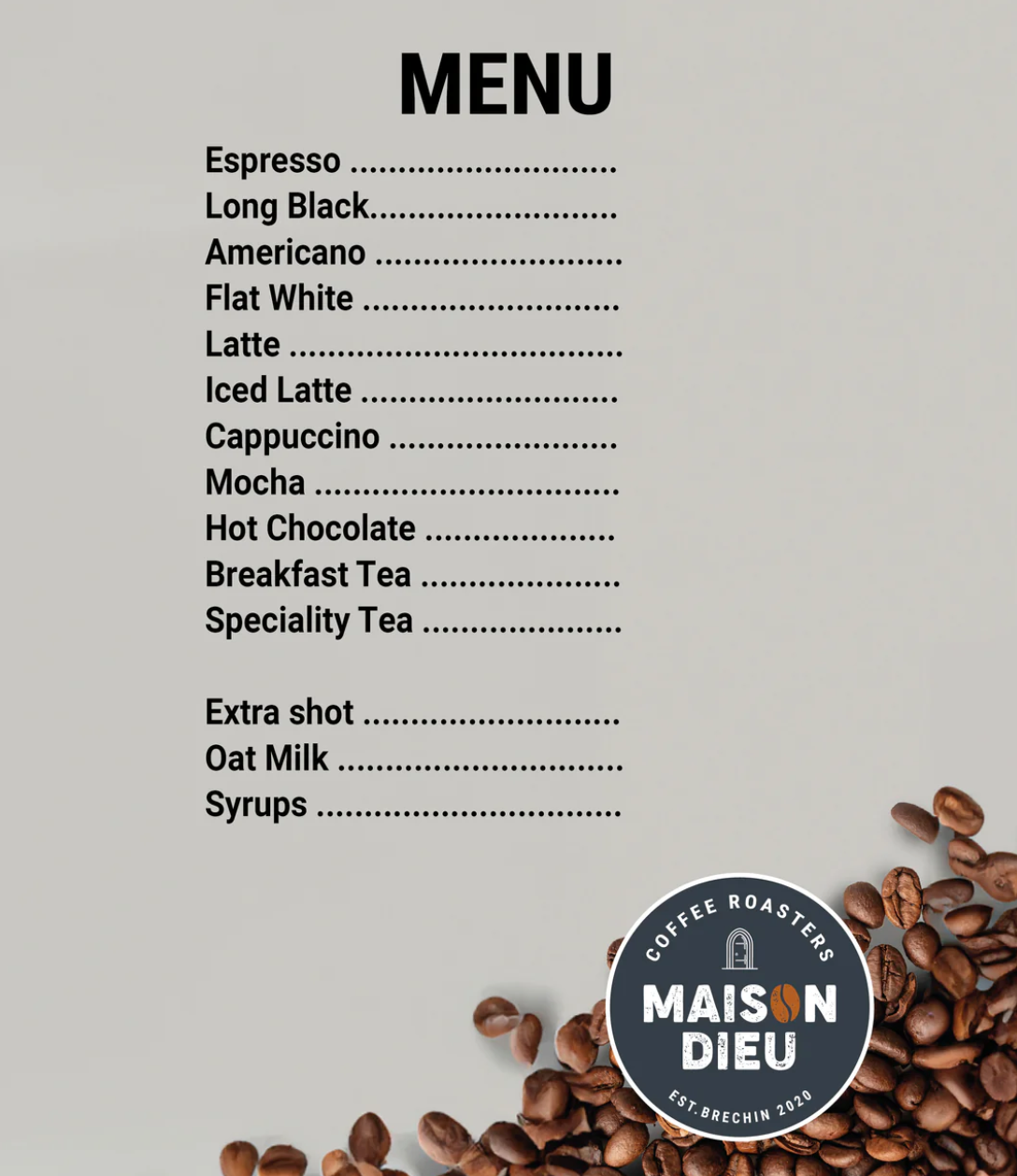 Opening in 2021, the original Maison Dieu Café in Brechin offers outdoor seating and to-go options. This location also hosts our official Roastery, which is responsible for all of the coffee we sell worldwide.