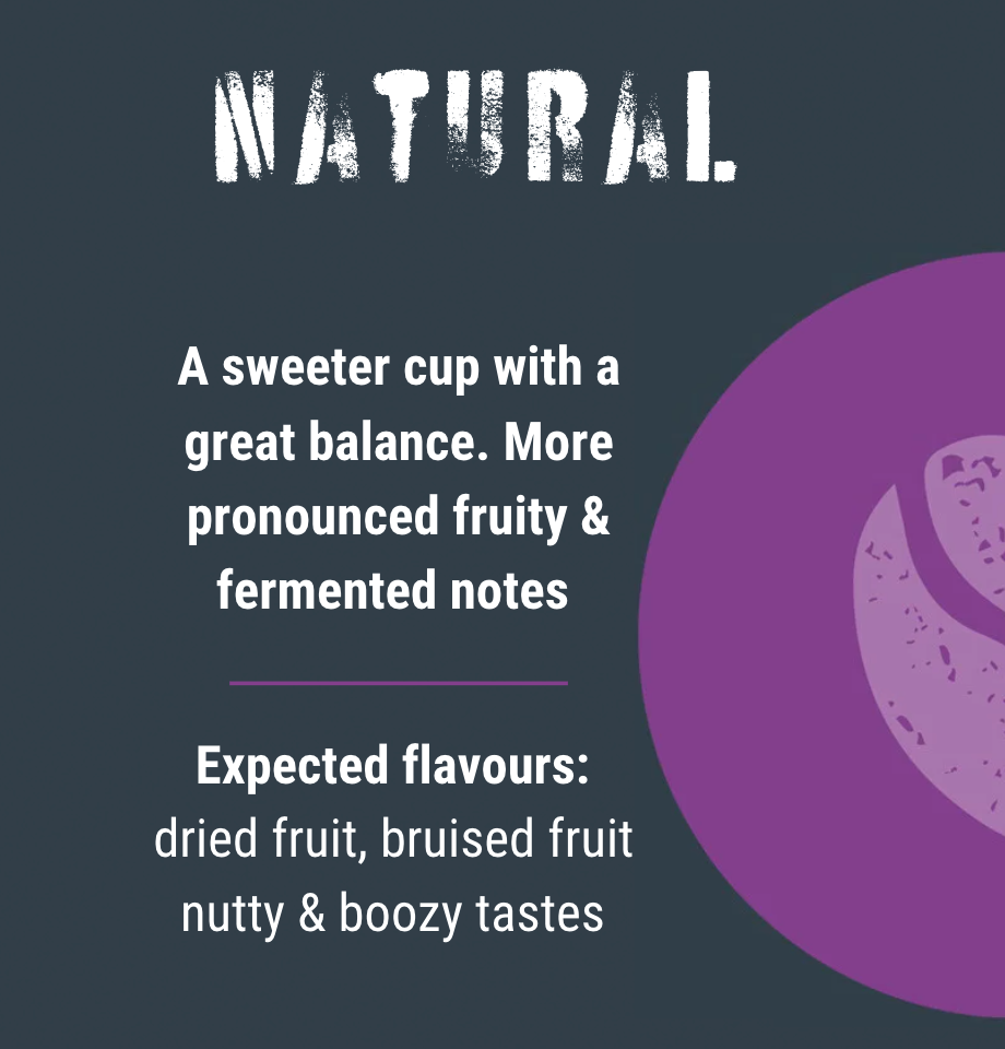 "Natural" refers to a coffee processing method which allows the beans to absorb more of the fruit's sugars, producing a nuanced, wine-like flavour profile.