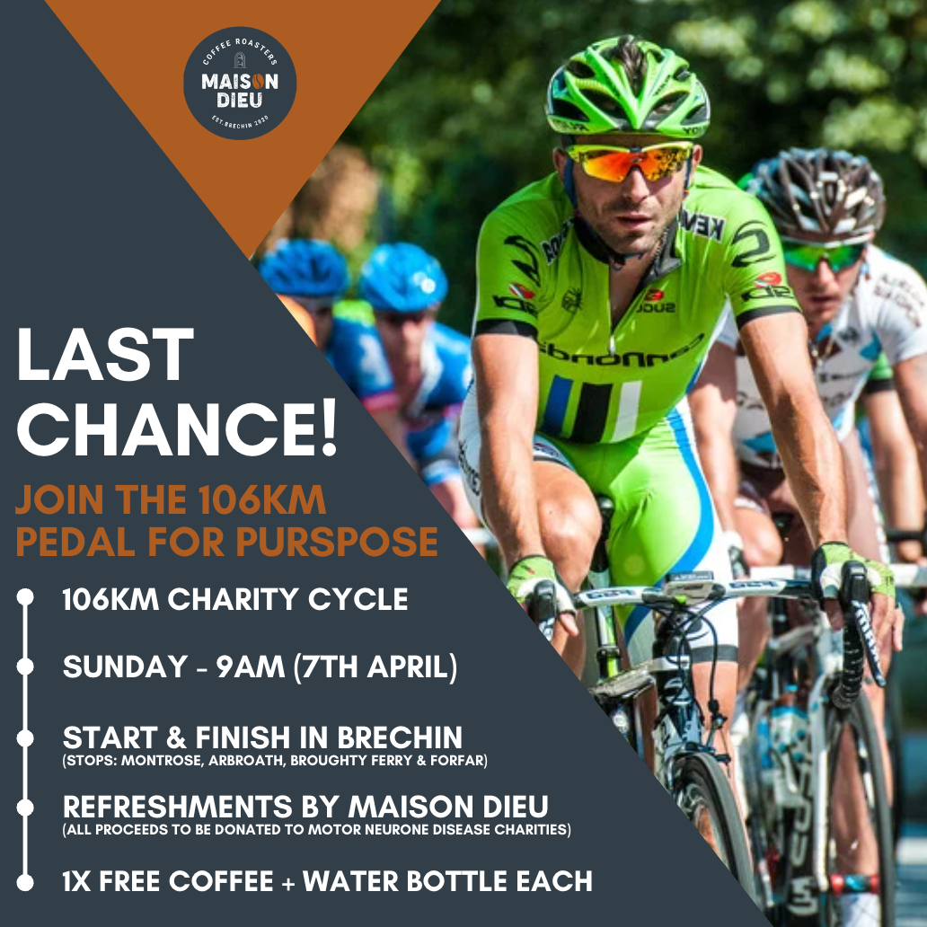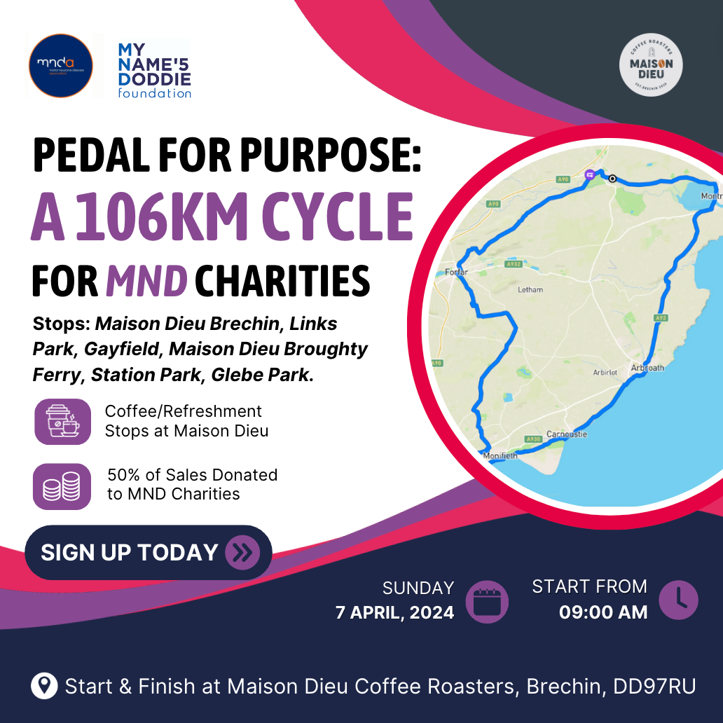 Join us in raising funds for two leading motor neuron disease charities - MND and My Name'5 Doddie, with a sponsored 106km community cycle around Angus.